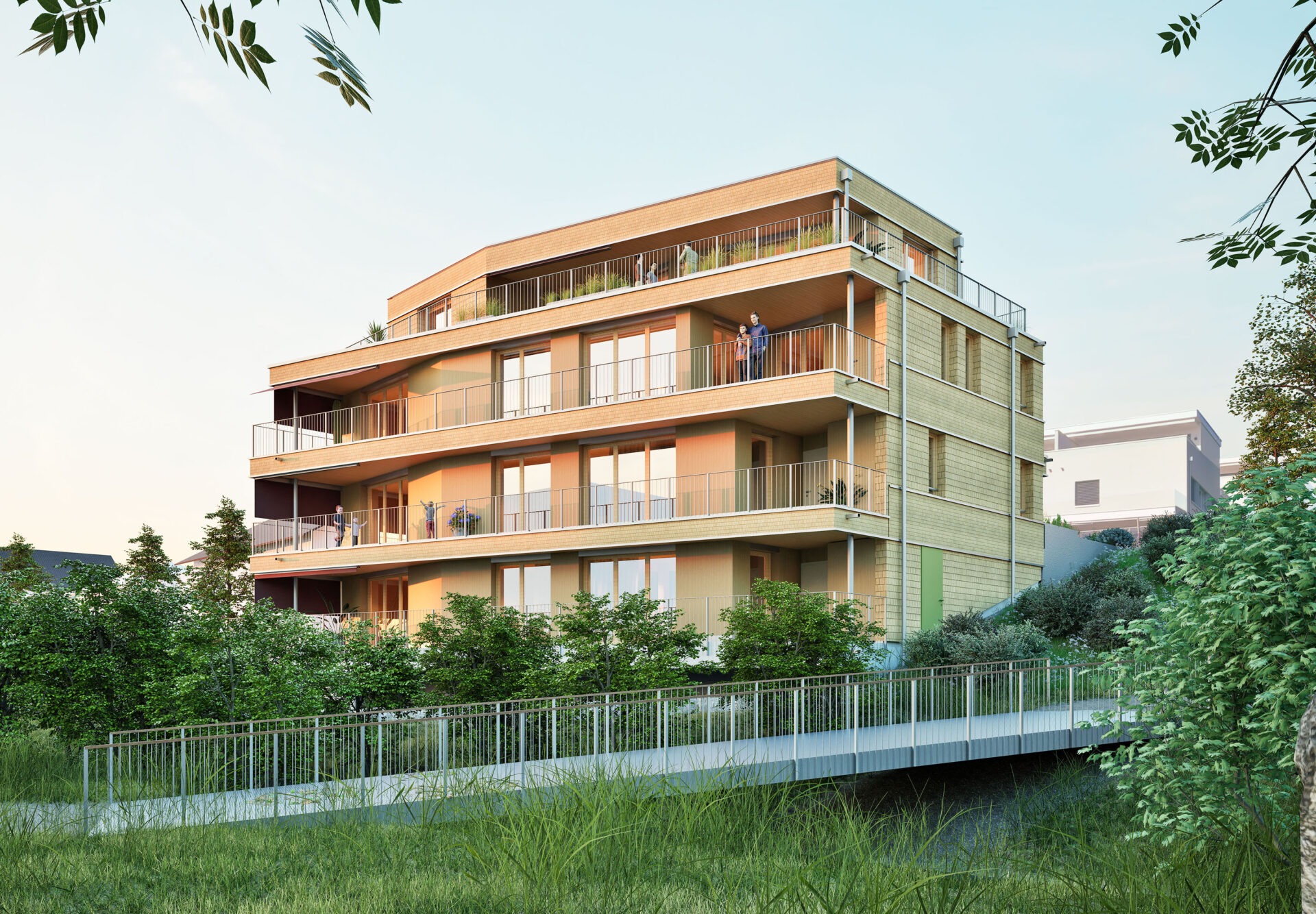 Es entstehen zwei 2.5 sowie zwei 3.5 Zimmer-Mietwohnungen, welche alle mit einem durchgehenden Balkon zum Wildbach ausgerichtet sind und einen freien Blick ins Grüne gewähren. Die grosszügige Attika-Maisonette-Wohnung überzeugt mit einer sehr einladenden Terrasse. Die Hanglage am Bach wird aufgenommen und das Gebäude optimal platziert, so dass einerseits mit der ebenerdigen Garage nur ein minimaler Aushub nötig wird und andererseits mit der Orientierung nach Süden ein grünes Reich mitten im Zentrum entsteht.